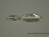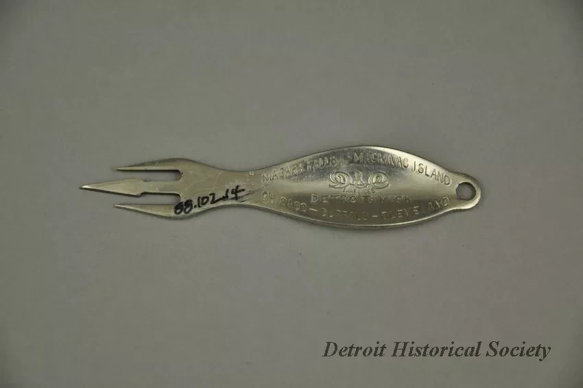 Silver Detroit and Cleveland Navigation Company corn holder. The utensil has three trident-like prongs, a convex oval-shaped handle, and a small hanging hole at the end of the handle. An ear of corn is engraved on the handle's recto, and "D&C Lake Lines, Detroit, Mich. Niagara Falls, Mackinaw Island, Chicago, Buffalo, Cleveland," is on the verso.