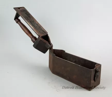 Iron: Flatiron: Charcoal-heated; "Tailor's Goose"; iron base is hollow with one end pointed and with a tube for draft running thru the bottom. Has a large chimney vent in front. Top is hinged in front and has wooden handle, fastens with a wire pin in back. Sliding draft cover on back of base has a raised image that depicts the face of a bearded man.