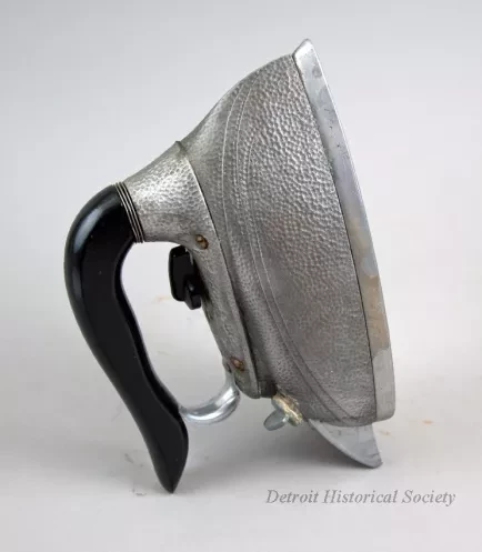 Electric iron made by Titeflex, Waverly Tool Company. Has grey hammered surface; black wooden handle; steam holes only in tip of pointed end; black cord plugs in top of heel rest; fabric settings and dial on center top beneath handle; red label on heel rest is marked: "Steam-O-Matic A Titeflex Product U.S. Patents 2,178,512...Serial No. 300178 Model No. B-30...Waverly Tool Co., Sandusky, Ohio." Has black/white fabric-covered electrical cord. Water for steam is poured through hole with metal plug at right side of handle.