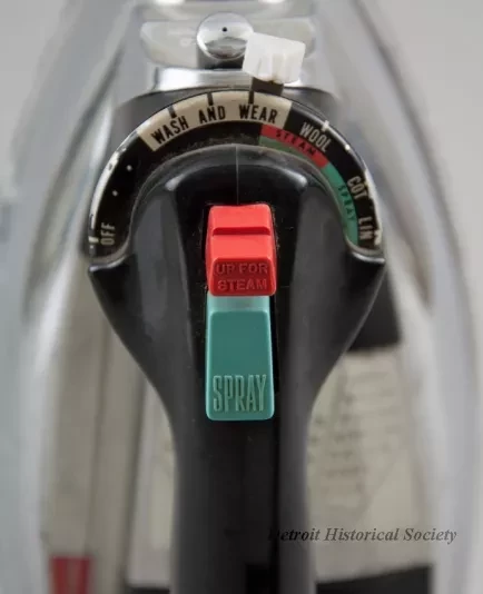 Iron: "General Electric Steam and Spray Iron"; aluminum sole with 7 steam holes; top black Bakelite with steam setting buttons in white, red and turquoise; with black and white cloth-covered cord; plate on bottom marked: "Cat. No. 11F81 Watts 1100 volts 120 A.C. only General Electric Co. Bridgeport, Conn. Made in U.S.A., 204."