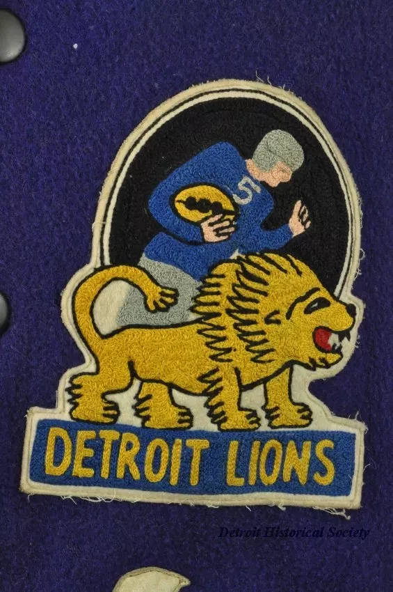 1 jacket. royal blue wool, sleeves of buff leather, neck cuffs and waist of blue and buff stockinette, inset of blue stockinette atarnisych, snap closure with large brass snaps, black pleated slash pockets on front, edged with buff leather, patch on left breast shows football player and Lion above words "Detroit Lions", chain stitch on white felt, black, blue, silver and gold, shield shaped patch on right sleeve blue, white and gold, "World Champions 52-53", lined with tan jersey.