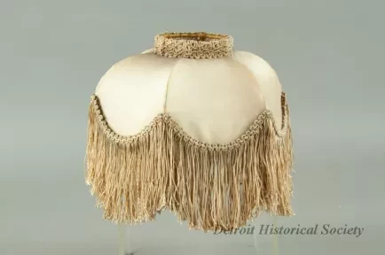 One small ecru-colored lampshade with fringe along the entirety of the edge. There is metal boning for the structure of the lampshade, which is covered in satin. A simple design of knots is at the top of the shade and at the bottom bordering the fringe. The original brown-paper tag is connected to the boning, which reads, "Brossy's Dyers & Cleaners / DETROIT / WEDNESDAY."