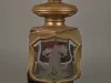 Lantern. A brass lantern bearing the name of James A. Van Dyke Company No. 5. The lantern is topped by an perching eagle and has three of its four shield-shaped faces covered with decorated glass. The front face is tinted blue and reads, "James A Vandyke 5" above an image of fire axes crossed over a speaking trumpet on a smokey scrollwork background. Moving clockwise, the next face is on untinted glass and is decorated with the shield from the Great Seal with leaves and flowers above, and leaves and an acorn below. The rear face is open. The final face is tinted red and is decorated with a scene of firefighters with early engine, ladder, and hose apparatuses battling a fire in a block of buildings. A large lone firefighter emerges from the door of the largest building. A flag atop the building is visible through the smoke and flames. The lantern is topped by a pair of rounded discs which support the eagle. The lower and larger disc has large round vent holes around its underside. The lantern is affixed to a black wooden base with an upright panel in front of the lantern's open face. A candle-shaped electric light and an oil lamp are both included.