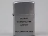 One lighter commemorating the opening of "Detroit Metropolitan Airport, September 26, 1958." The rectangular, pocket-size lighter is made of stainless steel with a brushed finish and has black engraved text on one side to note the airport opening. It has a has a hinged flip top with a spring mechanism, a knurled flint wheel, and a central enclosure for the wick and flame. Stamped text on the bottom reads "Price Associates, Springfield 3, Mass." and "Japan."
