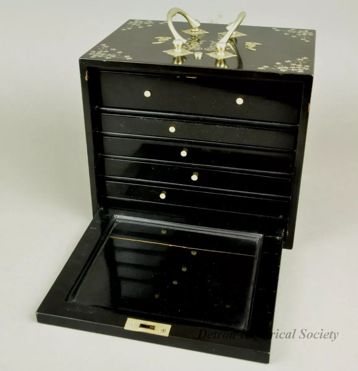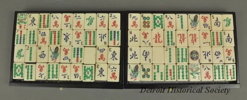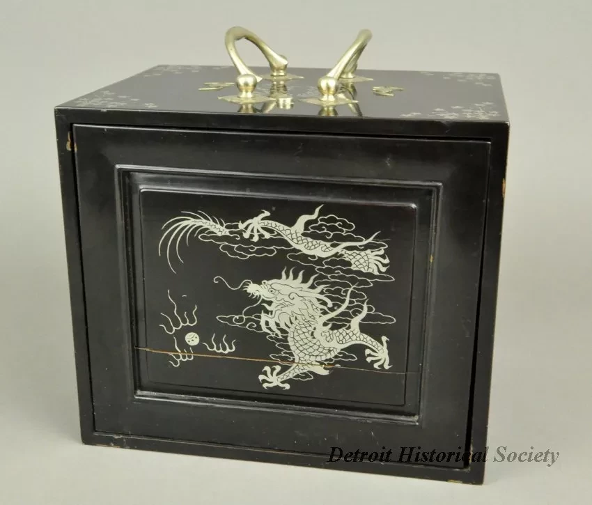 Mahjong set with ebony case. The case's front panel drops downward revealing five drawers containing the tiles, counting sticks, and dice. The box is decorated with an image of dragons and floral motifs painted in silver, and includes two silver handles on its top.