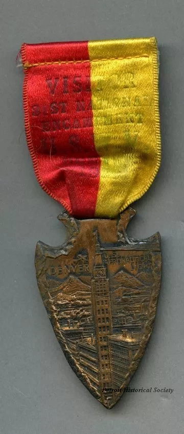 One commemorative medal worn by United Spanish War Veteran (USWV), Joseph Hoffman. The upper portion of the medal has a silk ribbon with red and yellow vertical stripes with gold lettering: "Visitor 31st National Encampment U.S.W.V. Denver 1929", beneath the ribbon there is an arrowhead-shaped brass medal that has an embossed aerial view of Denver and features an image of the "U.S. Aeronautical Light." The back of the medal is blank and no manufacturer's name is shown.