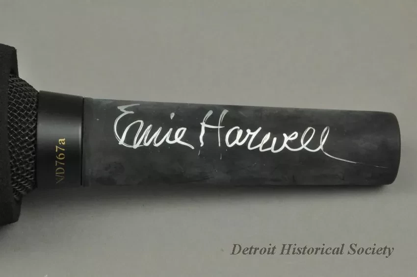 1 microphone. black plastic and metal, black foam cover, marked Electro-Voice N/D767a, autographed by Ernie Harwell.