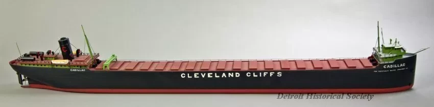 One ship model of the steamship, CADILLAC, which was a bulk carrier of the Cleveland Cliffs Steamship Company. The model has a single propeller, a bow thruster, and a smokestack with a red "C" painted on the sides. The model also has a red deck, light green trim on the pilothouse and cabin structures, and a black hull. The name, CADILLAC, is painted in white lettering on the sides at the bow and transom and the company name, "Cleveland Cliffs," is painted in large white lettering on the sides of the hull near the center of the ship model.