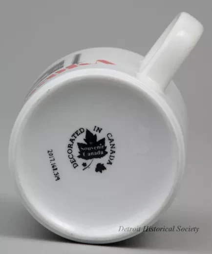 One souvenir coffee mug which features the passenger steamship, RMS Segwun, of the Muskoka Lakes Navigation and Hotel Company, Ltd., Gravenhurst, Ontario The mug is made of heavyweight white glazed china. It is cylindrical in shape with vertical sides, a rounded top edge, a flat bottom, and a rectangular handle on the side. On one side of the mug, a black and white image of a 36-cent Canadian postage stamp is shown that depicts a starboard side view of the RMS Segwun. A red postmark shows "RMS Segwun, Gravenhurst, Ont.," and "July 21, 1987," which was the date of the town centennial. Large red text beneath the stamp image reads "Muskoka." A black maple leaf logo is printed on the underside and along with text reads "Decorated in Canada by Souvenir Canada."