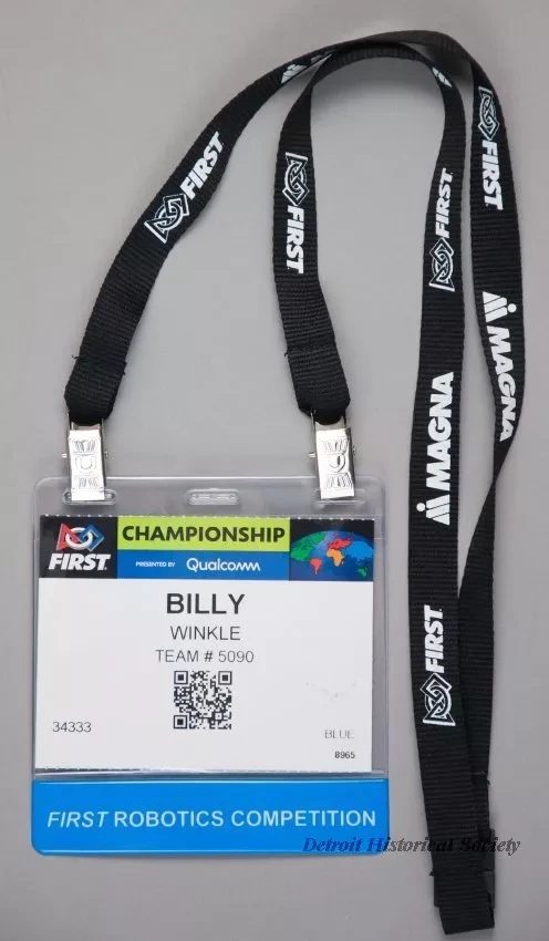 One nametag from the "First Robotics Competition" that was presented by "Qualcomm." The nametag is made of two layers of clear vinyl that have been heat-sealed along the edges. The top has three horizontal cutouts for clothing clips or neck strap clips. An opening below the top edge allows for insertion of a paper tag. The tag has a multi-color design along the top and black printed text below that reads "Billy Winkle, Team #5090," as well as a QR code. A separate blue vinyl band along the bottom of the name tag has white printed text that reads "First Robotics Competition." The nametag comes with a detachable neck strap that is made of 0.5-inch wide black nylon web material and has metal clips on the ends. The strap is printed with company logos and white text that reads "Magna" and "First."