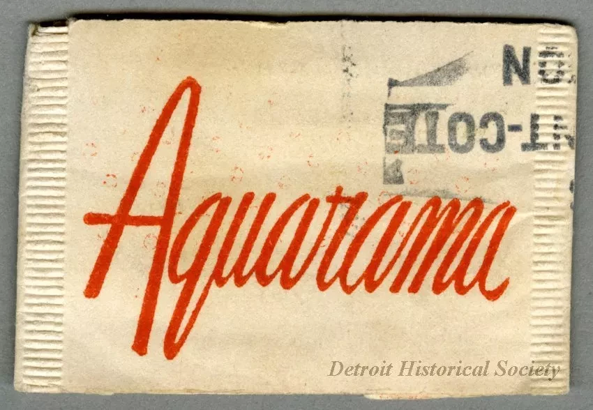 One single-serving packet of black pepper from the dining room of the cruise ship, SS Aquarama. The rectangular paper packet consists of four small paper tubes of pepper and a tear-off top. Red printed text on the tube side reads "Black Pepper" with opening directions. Small red printed text along the edge shows the manufacturer's name, "Diamond Crystal Salt Co." The other side of the packet has large red script text that reads "Aquarama."
