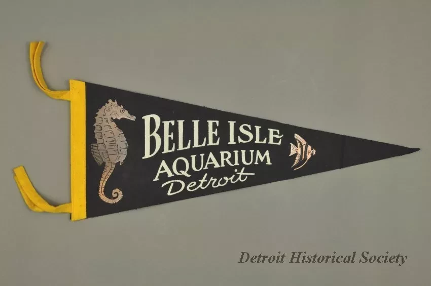 1 pennant. dark blue flannel, white letters "Belle Isle Aquarium Detroit". decorated with image of seahorse and tropical fish, triangle shape.