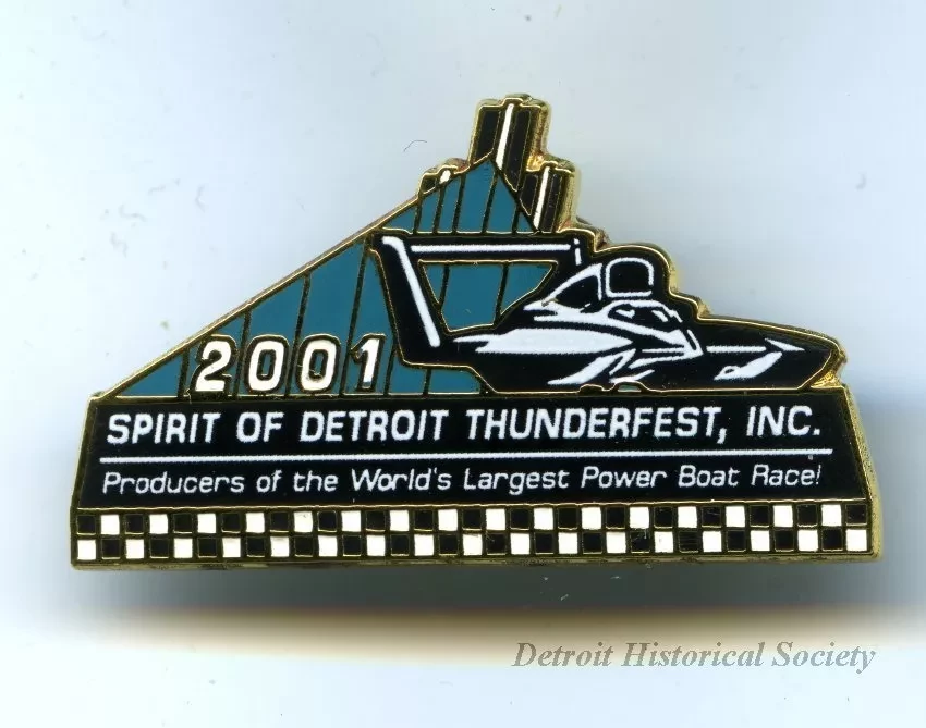 One gold-colored steel and enamel lapel pin advertising the "2001 Spirit of Detroit Thunderfest, Inc." The pin design features a black and white hydroplane in the foreground with blue/black/gold outlines of the Ambassador Bridge and the Renaissance Center in the background. The bottom of the pin notes "Producers of the World's Largest Power Boat Race!" and shows two rows of alternating black and white squares. The back has a pin and pinch spring fastener.