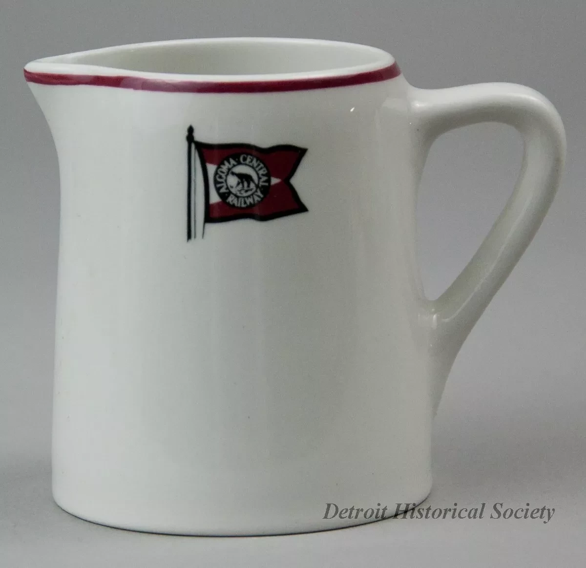 One cream pitcher from a dining room of one of the steamships of the Algoma Central Railway fleet. The pitcher is made of heavyweight, white glazed china. It has an open top with a small spout, an inward-rounded top edge, and a plain curved handle with a flat thumb rest. The straight sides flare outward slightly to form a wide circular base. A narrow red stripe encircles the pitcher along the top edge. A red/white/black image of the "Algoma Central Railway" company flag is stamped on one of the sides beneath the red stripe. The underside is stamped with a small crown logo and black text that reads "Duraline Super Vitrified, Grindley Hotelware Co.," and "Made in England, 3-76."