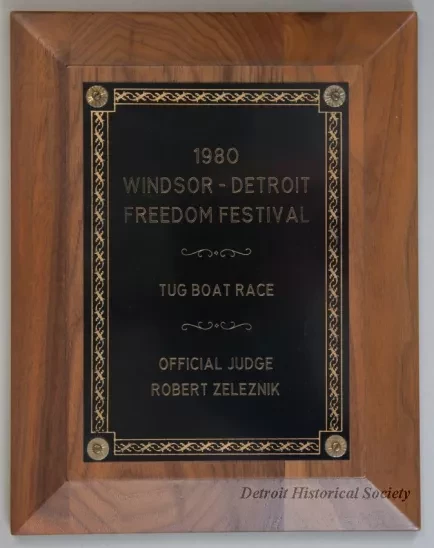 One commemorative plaque from the International Freedom Festival committee. The rectangular plaque is made of walnut wood that has wide beveled edges. A brass plate with a decorative engraved border is affixed to the front of the plaque with four small screws (on at each corner) and has engraved text that reads "1980 Windsor-Detroit Freedom Festival, Tug Boat Race, Official Judge, Robert Zeleznik." The wood on the front of the plaque has been finished with a low-gloss lacquer. The back is unfinished and has a hole for hanging on a wall. An adhesive label has black printed text that reads "Universal Trophy Centre, Inc.; Trophies, Plaques, Engraving, Bowling Shirts; 1777 University Ave. W., Windsor, Ont. N9B 1C5, Phone 258-1113."
