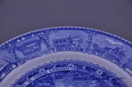 China Plate. A standard size dinner plate of blue on white china features various locomotives of the Baltimore and Ohio Railways, as well as a landscape portrait of Harper's Ferry, West Virginia, as identified in a banner at the bottom of the image. The central focus of the landscape is a bridge running over the Potomac River, with a pair of buildings on the right bank, and more smaller structures on the left. Foliage decorates the foreground at the bottom of the image and clouds grace the top. Enclosing the face of the plate is a flower and leaf band with scalloped ridges on the interior and a slight saw tooth pattern on the outer most edge. The design on the lip of the plate consists of transportation milestones and railroad locomotives. The bottom center panel depicts a pedestal marked "First Stone Balt. and Ohio Railroad," while a banner below reads, "Laid July 4, 1828." This is the only image that faces outward; all other images face inward toward the central landscape. Moving clockwise, the following panels depict a "Horse Drawn Car 1830," "The 'Tom Thumb' 1830," "The 'Atlantic' 1832," "The 'Philip E. Thomas' 1838," "'Winan's Camel' 1851," "Mogul '600' 1875," "The Cincinnatian," and the "Diesel Electric '51' 1937."