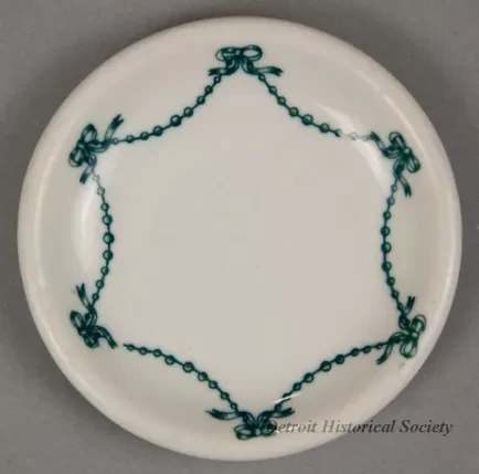 One small butter plate from the dining room of the passenger steamship, SS Tashmoo, of the Tashmoo Transit Company. The round plate is made of heavyweight, white glazed china. It has short curved sides with a rounded top edge. A small dark green bead and bow design is stamped on the top surface in a scalloped arrangement along the curved sides. No manufacturer's name or marks are shown.