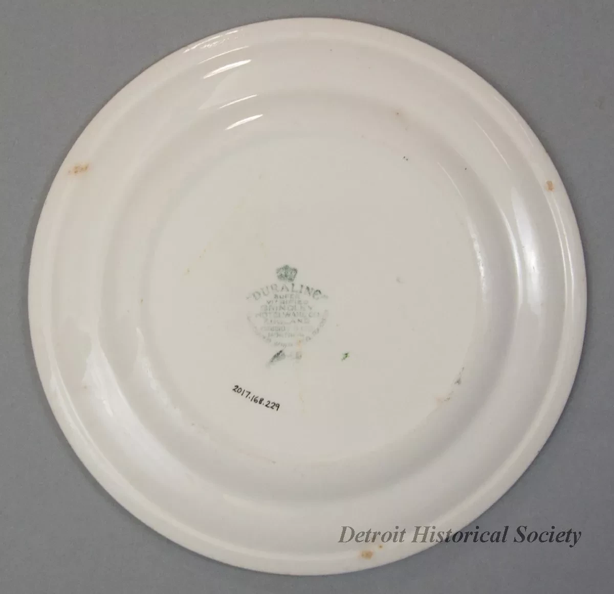 One dessert plate from the dining room of the passenger steamship, SS KEEWATIN, of the Canadian Pacific Railroad Great Lakes fleet. The round plate is made of heavyweight white glazed china. It has a flat, slightly-upturned rim and a thickened outer edge. A wide green band encircles the rim along the midpoint. At a break in the band, decorative green script text shows the letters, "CPR [Canadian Pacific Railroad]." Stamped black text on the underside of the plate reads "Duraline, Super Vitrified, Grindley Hotelware Co., England," and "Cassidy's, Ltd., Montreal, Vancouver, Winnipeg, Toronto, 3-50."