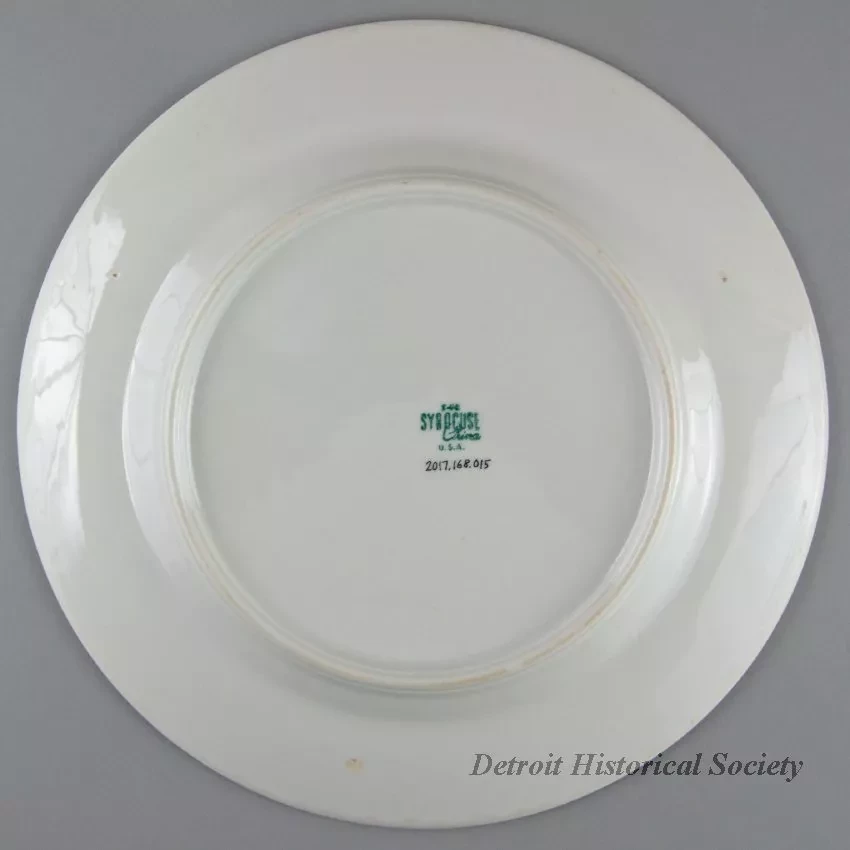 One dinner plate from the dining room of the Manoir Richelieu Hotel owned by Canada Steamship Lines. It is made of heavyweight, white glazed china and has a flat, upturned red rim with a rounded edge. Two narrow gold stripes are located along the outer edge of the rim and a single narrow gold stripe is located at the inner edge. A coat of arms with a shield, crown, and anchor design (Manoir Richelieu Shield pattern) is stamped at the center of the plate. Stamped text on the underside of the plate reads "2-66, Syracuse China, U.S.A."