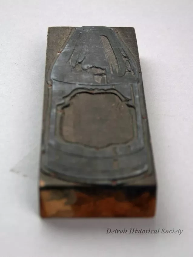 One engraving plate used for printing Vernor's advertisements, brochures, and/or product packaging. The rectangular plate is made from a thin sheet of zinc that has been mounted on a wood block with thirteen small nails. The plate has been cut and etched with a flat relief engraving and a halftone image that shows a bottle of Vernor's Ginger Ale. The label area of the bottle has been cut out which would allow different label designs to be added separately.