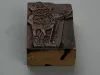 One engraving plate used for printing Vernor's advertisements, brochures, and/or product packaging. The irregularly-cut plate is made from thin sheets of copper and zinc that have been bonded together. Four small nails have been used to attach the plate to a wood block. The copper side has a flat relief engraving that depicts an image of the Vernor's gnome, who is standing and pointing with his outstretched left arm. The numbers, "45/164/5," are stamped near the edge of the image.