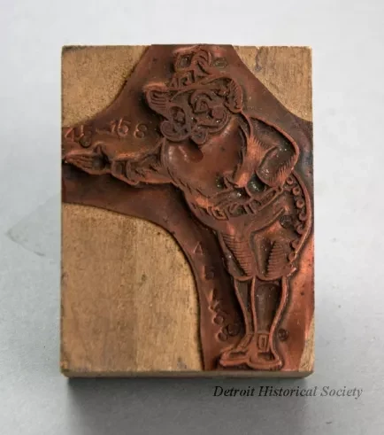 One engraving plate used for printing Vernor's advertisements, brochures, and/or product packaging. The irregularly-cut plate is made from thin sheets of copper and zinc that have been bonded together. Five small nails have been used to attach the plate to a wood block. The copper side has a flat relief engraving that depicts an image of the Vernor's gnome, who is standing while bent slightly at the waist, and is gesturing with his outstretched right arm. The numbers, "45-158," are stamped in two locations near the edges of the image.