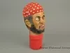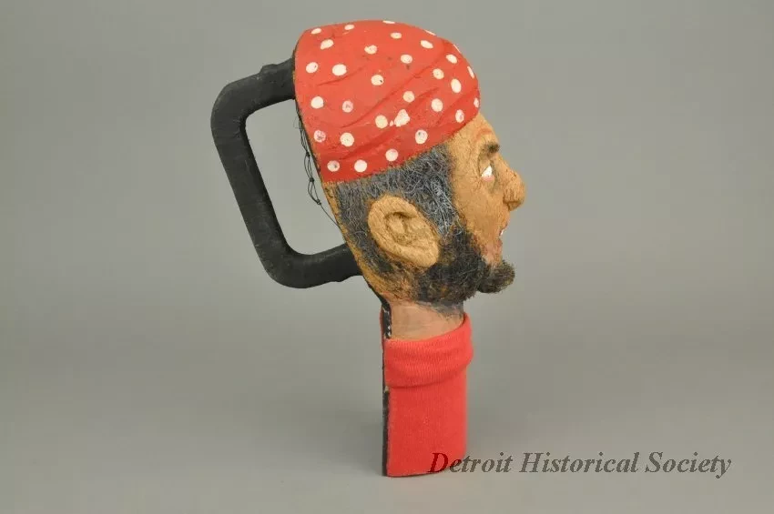 Puppet, hand-held with handle-bar in back. Pirate with red headscarf with white dots, red turtle neck. Head / neck puppet. Carved coconut shell w/ possible papier-mâché sculpted neck. Jaw once moved . Painted beard/face. very good condition, cracking to handle, missing tool for mouth movement. Likely used by Captain Jolly (Toby David) on the Popeye and Pals television show on CKLW.
