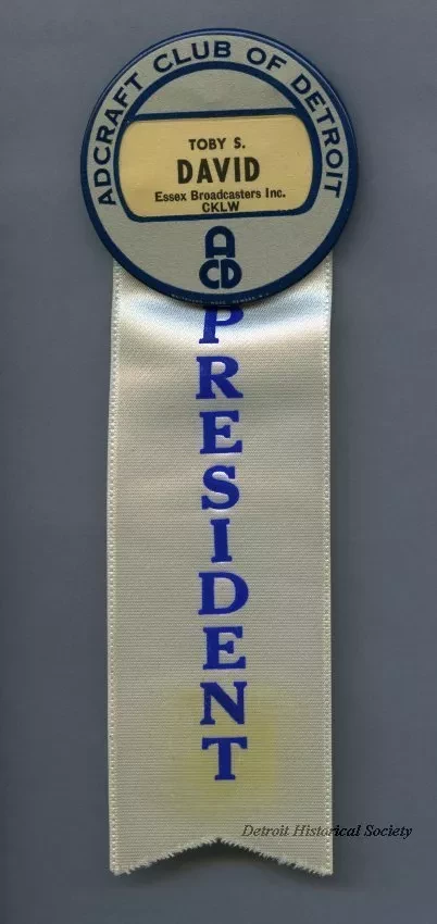 One membership badge for "Toby S. David (Essex Broadcasters Inc. CKLW)" who was president of the Adcraft Club of Detroit. The circular metal badge has blue text along the front and a window at the center for a paper name tag insert. The back has a metal pin. A white satin ribbon hangs beneath the badge and is stamped with blue text that reads "President."