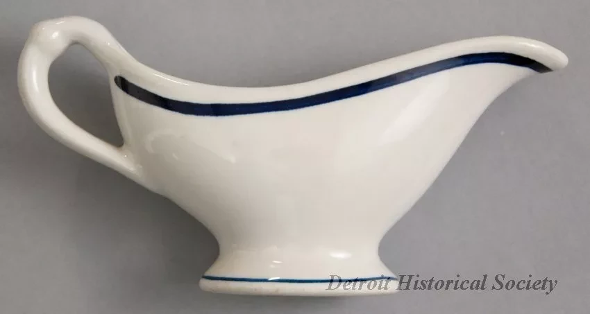 One small sauceboat from a dining room of one of the Lake Michigan car ferries of the Pere Marquette Railway. The narrow, oval-shaped sauceboat is made of white glazed china. It has an open top, a long spout, gently-curved sides, a decorative curved handle with a narrow blue stripe on the outside, and an oval-shaped base. A narrow blue band encircles the outside of the sauceboat just below the rim and a very narrow blue stripe encircles the oval base just above the bottom edge. A blue image of one of the company ferries is stamped at the center of one side of the sauceboat along with blue text that reads "Pere Marquette." The underside is stamped with black text that reads "Albert Pick Co., Inc., Chicago," and "Vitrified China."