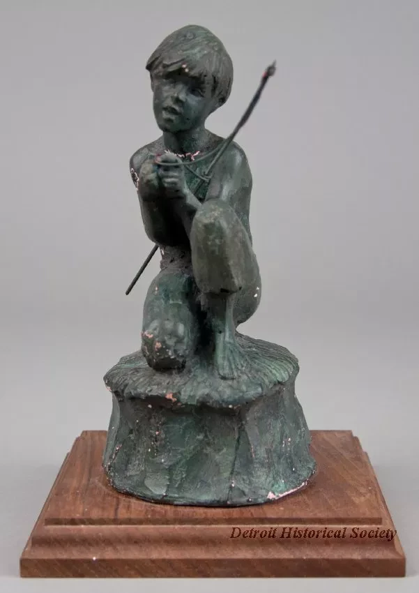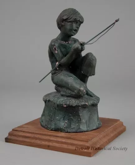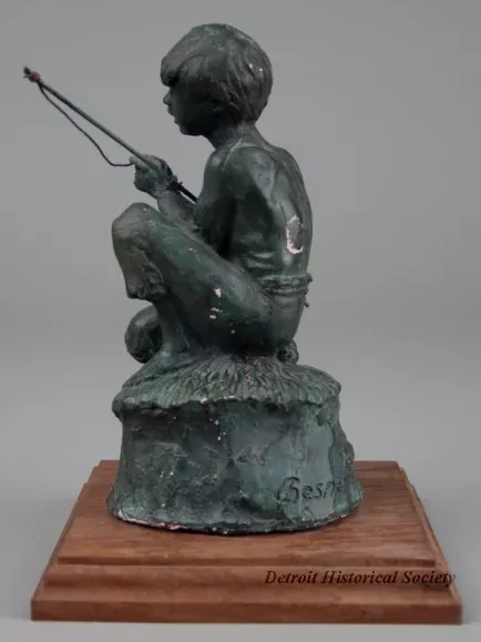 One plaster prototype sculpture that depicts a young boy who is holding a fishing rod. The plaster surface is mostly smooth and has a faux bronze finish. The sculpture shows the figure of a young boy who is kneeling/crouching on the bank of a stream or lake. He is wearing long pants, but no shirt or shoes, and is holding the fishing rod under his right elbow while holding the line with both hands. The sculpture is mounted on a square, walnut wood base that has a decorative routered edge. The artist has signed his name, "Chesney, 1973," near the lower edge of the sculpture at the back.
