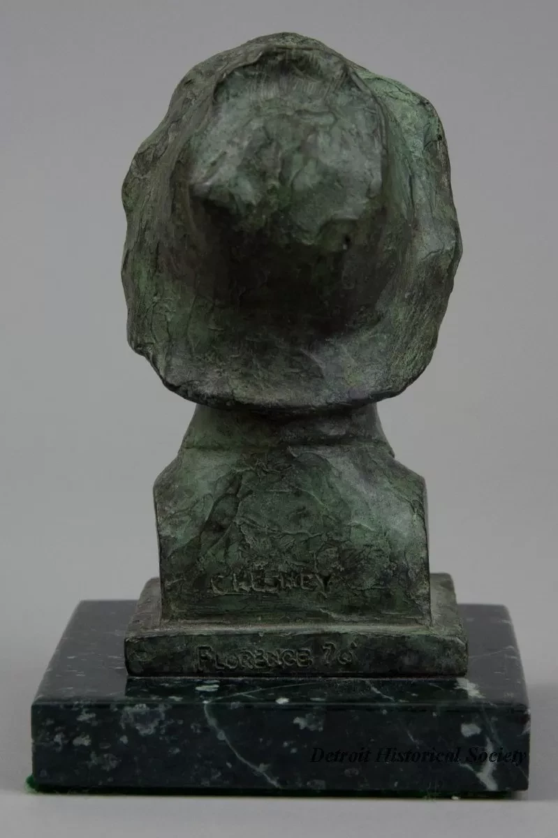 One small bronze bust of a young Italian boy. The brown metal sculpture has a green patina and a slightly rough finish. It shows the head and partial shoulders of an Italian boy who is wearing a floppy hat, a shirt with a tall collar, and a large cravat. The sculpture includes a small square bronze base that has been mounted on a larger square, dark green/black marble base. The artist has signed his name, "Chesney," and "Florence 70" on the back of the sculpture at the bronze base.