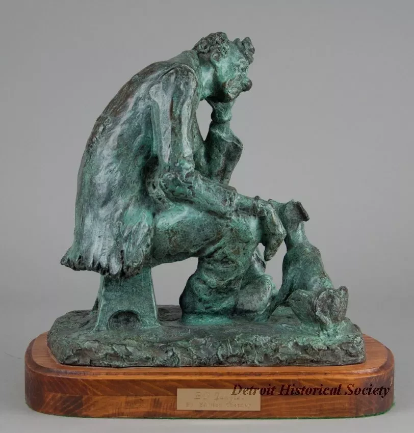 One bronze sculpture of the circus clown, "Bo Jangles." The brown metal sculpture has a green patina and a slightly rough finish. It shows the figure of a tired circus clown who is seated on a small stool and is looking at a small dog that is seated near his right knee. The clown is wearing a tiny hat, a big round nose, a ragged and patched jacket, and worn pants. The sculpture includes a rough, rectangular bronze base that has been mounted on a thick, pine wood base. The wood base has a plain routered edge and rounded corners. It has been stained light brown and finished with clear lacquer or varnish. The artist has signed his name, "Chesney," on the back of the stool on which the clown is seated. An engraved brass plate on the front of the wood base reads "Bo Jangles, by Edward Chesney."