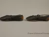 Women's black sateen, heel-less shoes with square toes, and white leather lining.