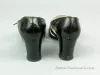 One pair of women's black leather dress shoes. The Mary Jane style shoes have slightly square toes, two straps across the vamp with brass buckles, 2.25" high Cuban heels, and leather soles. Both sides of the shoes have openings just past the toes and above the arch. Gold-colored text on the inside sole reads "D'Auria, Via Duemacelli, Roma."