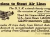 Sign, printed in black text on cardboard, congratulating Stout Air Lines from the Department of Street Railways. The text of the sign reads "Congratulations to Stout Air Lines. The D.S.R. extends hearty congratulations upon the occasion of your Fourth Anniversary. Stout Air Lines -- oldest passenger line in the U.S. -- have flown 1,250,000 miles, carrying 122,000 passengers, without a single injury. D.S.R. busses make 16 trips daily from Detroit Auto Club to Ford Airport to accommodate passengers leaving for and arriving from Chicago and Cleveland. - Department of Street Railways." An image showing a right side profile view of a Stout Air Lines airplane is at the top left and an image showing a right side profile view of a Stout Air Lines bus is at the bottom right.