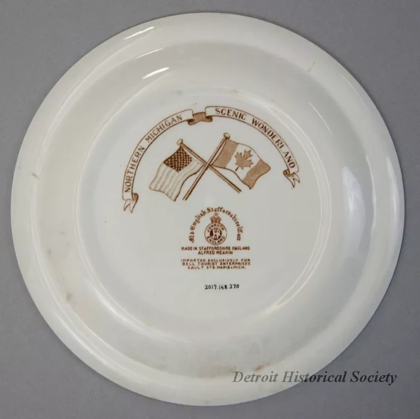 One souvenir plate from northern Michigan. The round plate is made of glazed white china. It has a flat, narrow, slightly-upturned rim that is stamped with a decorative, sepia-toned floral and leaf pattern. The center of the plate is printed with three sepia-toned drawings of popular tourist sights including Tahquamenon Falls, the Mackinac Bridge, and the ship locks at Sault Ste. Marie. Short captions are shown beneath each drawing. The plate underside is stamped with a crossed U.S./Canada flags logo and sepia text that reads "Northern Michigan Scenic Wonderland" and "Old English Staffordshire Ware." One small logo is also shown with additional text that reads "Jonron, England," as well as "Made in Staffordshire, England" and" Imported Exclusively for Bell Tourist Enterprises, Sault Ste. Marie, Mich."