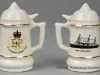 One souvenir set of salt and pepper shakers which commemorate the visit of the Royal Yacht, Brittania, for the official opening of the St. Lawrence Seaway by President Eisenhower and Queen Elizabeth II on June 26, 1959. The shakers are made of china in a bone/ivory color and are shaped like miniature covered tankards. Narrow gold-colored stripes encircle each shaker near the top and above the base. The royal insignia is shown on the front with black text that reads "St. Lawrence Seaway, 1959." A black silhouette drawing of the royal yacht is shown on the opposite side with black text that reads "H.M.Y. Brittania," Corked openings are located on the underside of each shaker along with gold-colored text that reads "01, Curated by Monogram of Edwards," and "U.S. Origin."