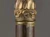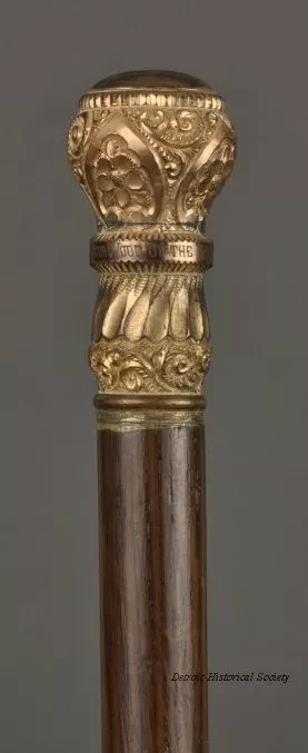 Walking Stick. A walking stick made from wood from the Independence, the first steamship on Lake Superior, which sank following a boiler explosion in 1845. The ornate knob-shaped metal handle includes a band inscribed with, "Wood of the Independence first boat sailed L. Superior" among its cast scrollwork. The initials "I. M." are engraved into the top of the handle in a blackletter typeface. "Gold roll plate" is also inscribed at the base of the handle suggesting it is made of brass laminated with gold. A metal cleat is attached to the foot of the stick.