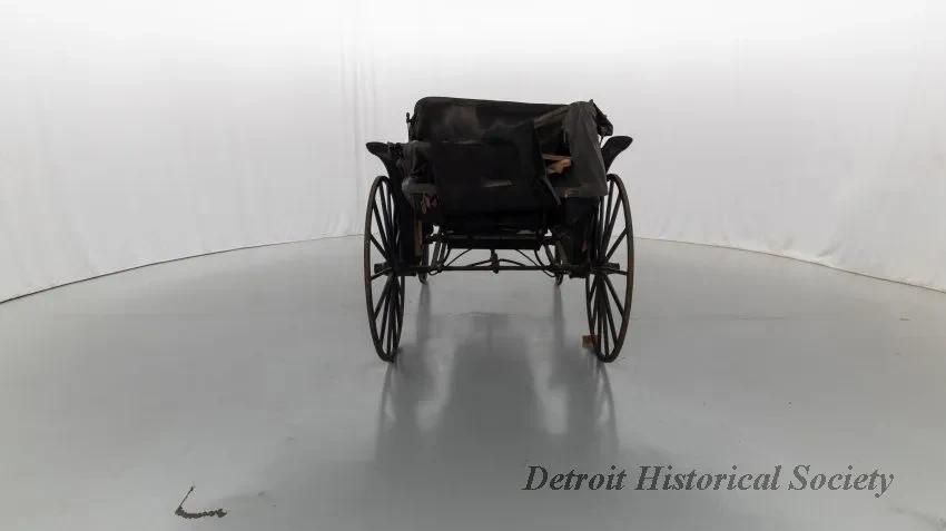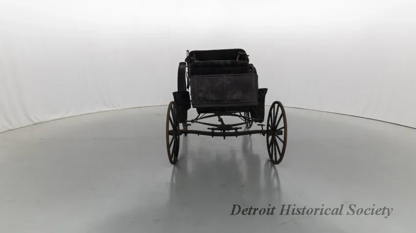 One all-black auto-top surrey (carriage). The surrey has two rows of two-person seats and a retractable top. There are no doors but openings to get in and out. The surrey does not have a brand tag/mark and has steel rimmed wheels, leather dividers/interior, and cloth upholstered seats.