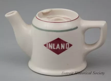 One small teapot from the dining room of the bulk carrier, SS Philip D. Block, of the Inland Steel Company fleet. The pot is made of heavyweight glazed china of a bone/ivory color. It has a curved spout, a wide depressed top with a removable circular lid, and a small curved handle with a flat thumb rest. The sides are fairly straight with an inward curve at the top and a slight outward flare at the base. The circular lid has a narrow lift handle at the center with a red stripe on top and a red stripe along the outer edge. A narrow red stripe encircles the outside top edge of the teapot rim and a narrow gray stripe is located about 3/8" beneath it. A red diamond-shaped company emblem, which shows the name, "Inland," in bone/ivory-colored text, is stamped below the stripes on one side of the teapot. The underside is stamped with black text that reads "Albert Pick Co., Inc., Chicago," and "Made in U.S.A., E7."