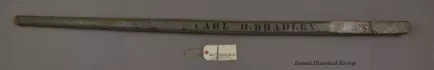 Tiller from the lifeboat of the steamer CARL D. BRADLEY with a Bradley Transportation Line tag. Wood painted gray with ship's name stenciled in black. The BRADLEY sank in northern Lake Michigan on November 18, 1958. Two crewmen were rescued by CG Cutter SUNDEW, but thirty three men perished.