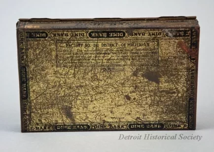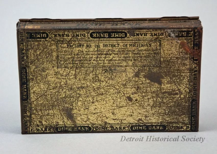 One cigar tin from the "Dime Bank" of Detroit. The tin is made of thin sheets of brass-plated steel that have been bent and crimped at the edges to form a rectangular box that has a hinged lid on top. The exterior top lid has a large black, oval-shaped, decorative design and large black text that reads "Dime Bank." The exterior edges are decorated with repeating design that features the name, "Dime Bank," in small black text. The inside surface of the lid is painted pale yellow and features an image of the Dime Bank Building in Detroit along with the name, "Dime Bank," in large black and gold-colored letters. The cigar price of 5¢ (marked down from 10¢) is shown in the upper left corner. The interior surface of the box has a brass finish. Black printed text on the exterior bottom of the box reads "Factory No. 261, District of Michigan. Notice: The manufacturer of the cigars herein contained have complied with all the requirements of law. Every person is cautioned not to use this box for cigars again, or the stamp thereon again, nor remove the contents of this box without destroying said stamp under the penalties provided by law in such cases."