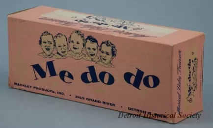 One "Me-Do-Do Musical Baby Trainer." The potty trainer consists of a shallow, oval-shaped pink plastic bowl with a small enclosed music box. It has metal support arms on opposite sides which allow the assembly to be set into a toilet bowl. When the child takes care of business, the falling waste is captured in the plastic bowl which then tips the contents into the toilet bowl. The tipping action causes a short musical tune to play which rewards the child for a successful potty event. The potty trainer includes a cardboard box, brochure, instruction sheet, and brass winding key for the music box. It was manufactured by "Mackley Products, Inc.," of Detroit.