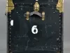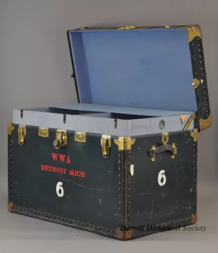 One steamer trunk. The large rectangular trunk is made of vulcanized fibre board which is painted dark blue. The edges have reinforced strips that have been riveted in place. The corners are all reinforced with brass-plated steel fittings. The trunk has a hinged top with metal latches on the front and a locking latch at the center. Leather strap handles are located on each end of the trunk. Red painted text on the front panel shows "WWA [Wendell W. Anderson], Detroit, Mich." White painted text on the front and end panels shows the number "6." The trunk is fully lined with light blue fabric and has a removable top tray. No manufacturer's marks are visible.