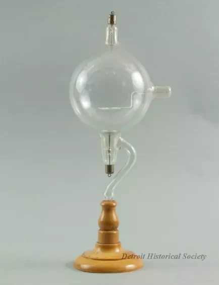 Blown-glass bulb set on a turned wooden base. Metal electrical connections at top and bottom of bulb. The top connection is attached to a smal metall disc about 3/8 of an inch in diameter inside the bulb. The bottom connection is connected to a metal parabola about 1.25 inches in diameter. There is a small, approximately 1/4 inch, square sheet of metal foil in the center of the bulb. The foil is suspended by a glass frame.