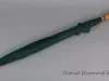 One man's large umbrella. The umbrella has a turned wooden handle with a chrome metal ferrule, a wood shaft, metal fittings, a dark green nylon fabric top with metal support struts, a chrome metal tip, and a nylon fabric closure strap. The name, "Hudson's," is shown is tan letters on the outside surface of the nylon fabric top.
