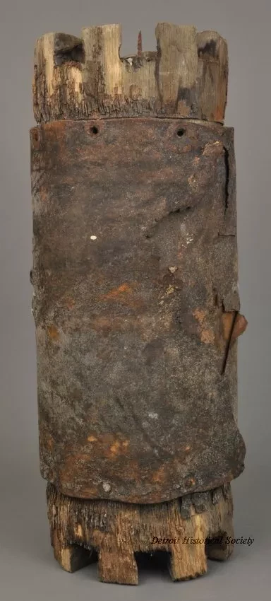 Partial ship's helm: Leather-bound wooden post with a ring hoop on its side and teeth carved into each end alongside exposed nails, presumably intended to support the ship's wheel. Recovered from the wreck of the early freighter EBER WARD, which sank in the straits of Mackinac on April 20, 1909, with five lives lost.