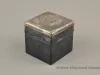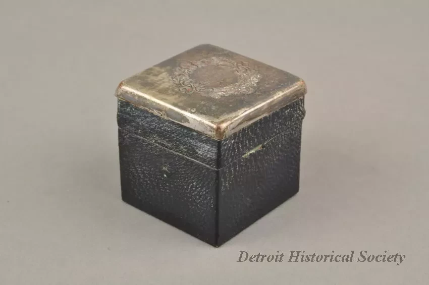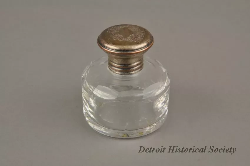 Writing set, glass and silver, 5 pieces; consisting of : (a) jar, glass with silver screw-on top; (b) ink well; glass bottle set in black box with stopper set in hinged lid, silver top with etched design, green interior; (c) silver box with etched design; (d) silver blotter with etched design on top (blotter missing); (e) glass jar with screw-on silver lid with etched design.
