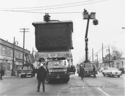 Digital scans (one uncropped at 300dpi, the other cropped at 600dpi) of a black and white photo of the trailer carrying the World's Largest Stove proceeding north on Van Dyke Avenue between Brentwood Street and Seven Mile Road, during its move from near the Belle Isle Bridge to the State Fair Grounds on April 11, 1965. The boom of a utility truck is being used to lift a traffic signal cable that spans the street in the foreground, as the stove approaches. Several workers watch from the ground below. Vandy's is in the background on the left.