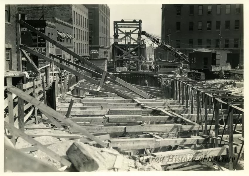 Digital scan of a sepia-toned photo taken overlooking the bracings for the excavation dug along Randolph Street during the construction of the Detroit-Windsor Tunnel, as taken from Woodbridge Street, facing south. The beams buttressing the sides of the buildings on the east side of the street also extend across the cut. A Mark R. Hanna Company crane is on the west side of the frame. Signs for United Trucking Service, and H. and G. Cartage are painted on the side of the building at the northeast corner of Randolph and Franklin. Riverside Lunch is visible on the northeast corner of Atwater and Randolph, and the Crane Company building is on the southeast corner. A sign for the Belle Isle ferry, and the Detroit River are in the background. "Detroit and Canada Tunnel Contract - Section 5, Looking South from Randolph & Woodbridge Streets, 4 P.M.; Jul 30, 1929, 8B-112," was handwritten on the verso.